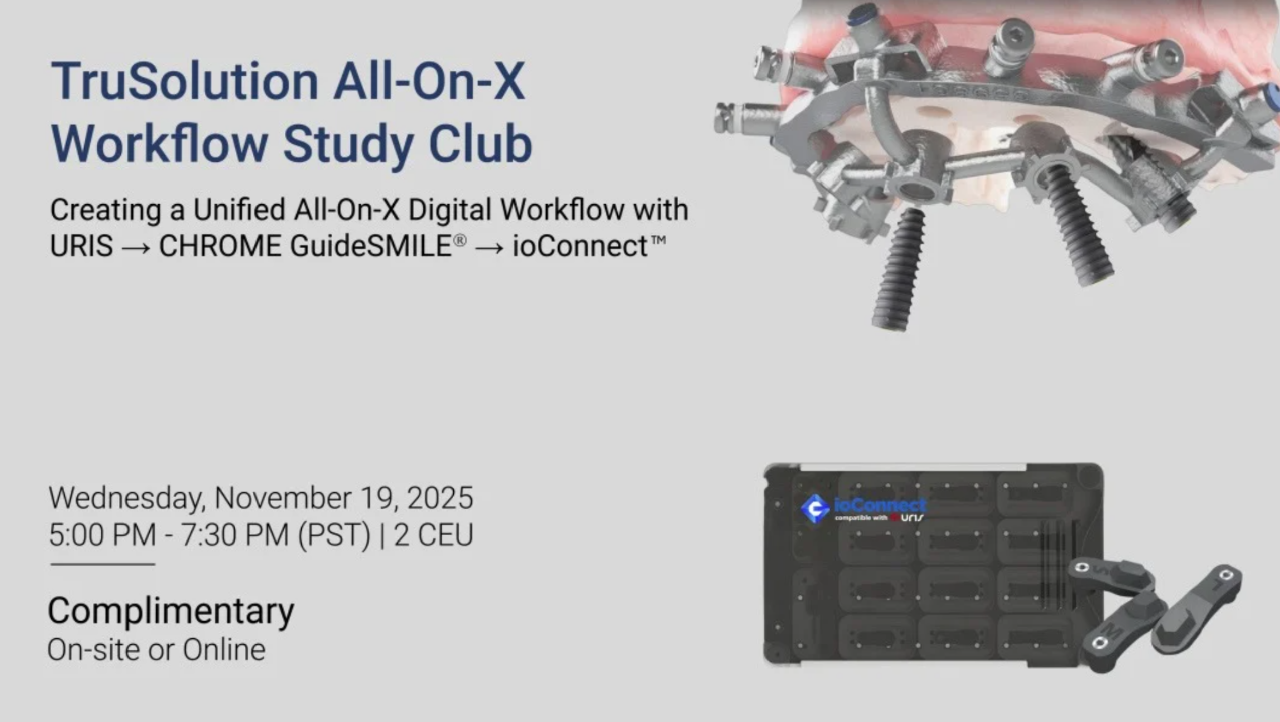 Join us for the TruSolution Study Club, created for URIS users ready to master the next level of digital implant workflows. Discover how URIS implant system, ioConnect™ intraoral grammetry, and CHROME GuidedSMILE® unite surgical, restorative, and lab phases into one streamlined digital process.